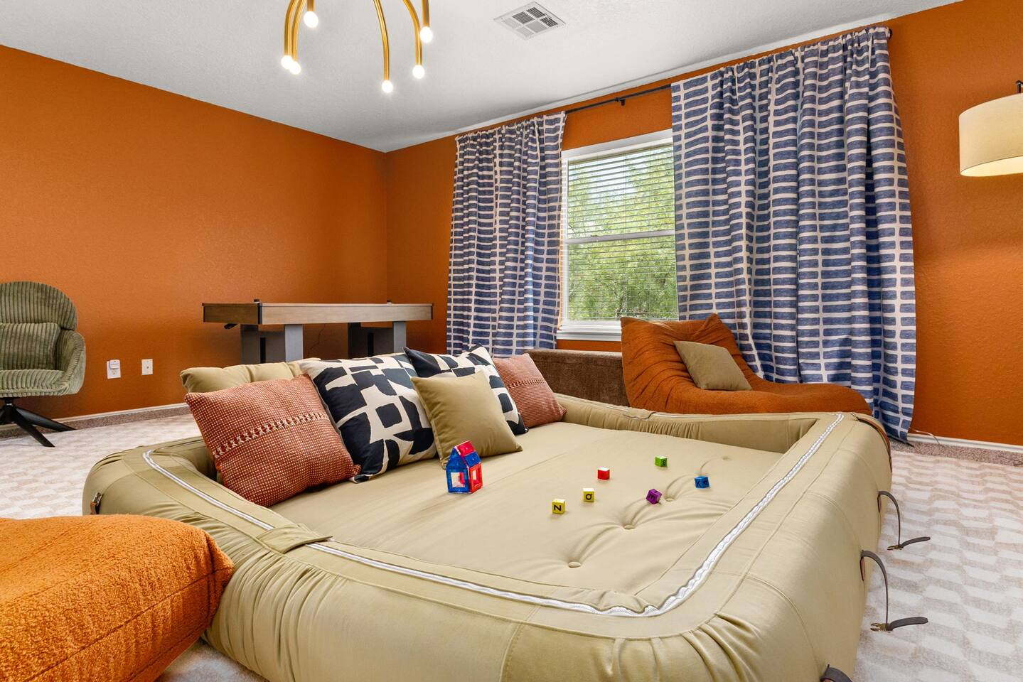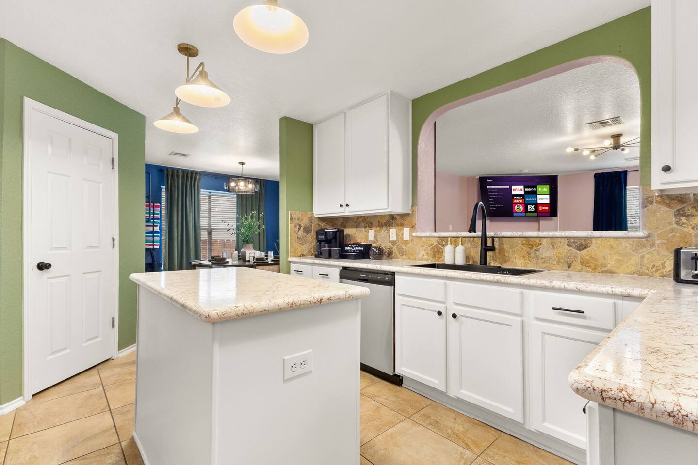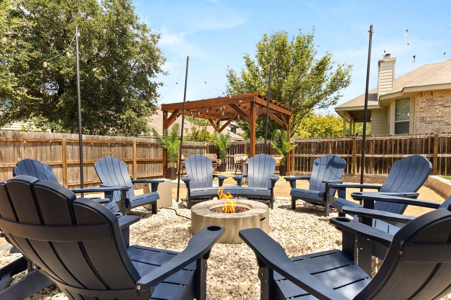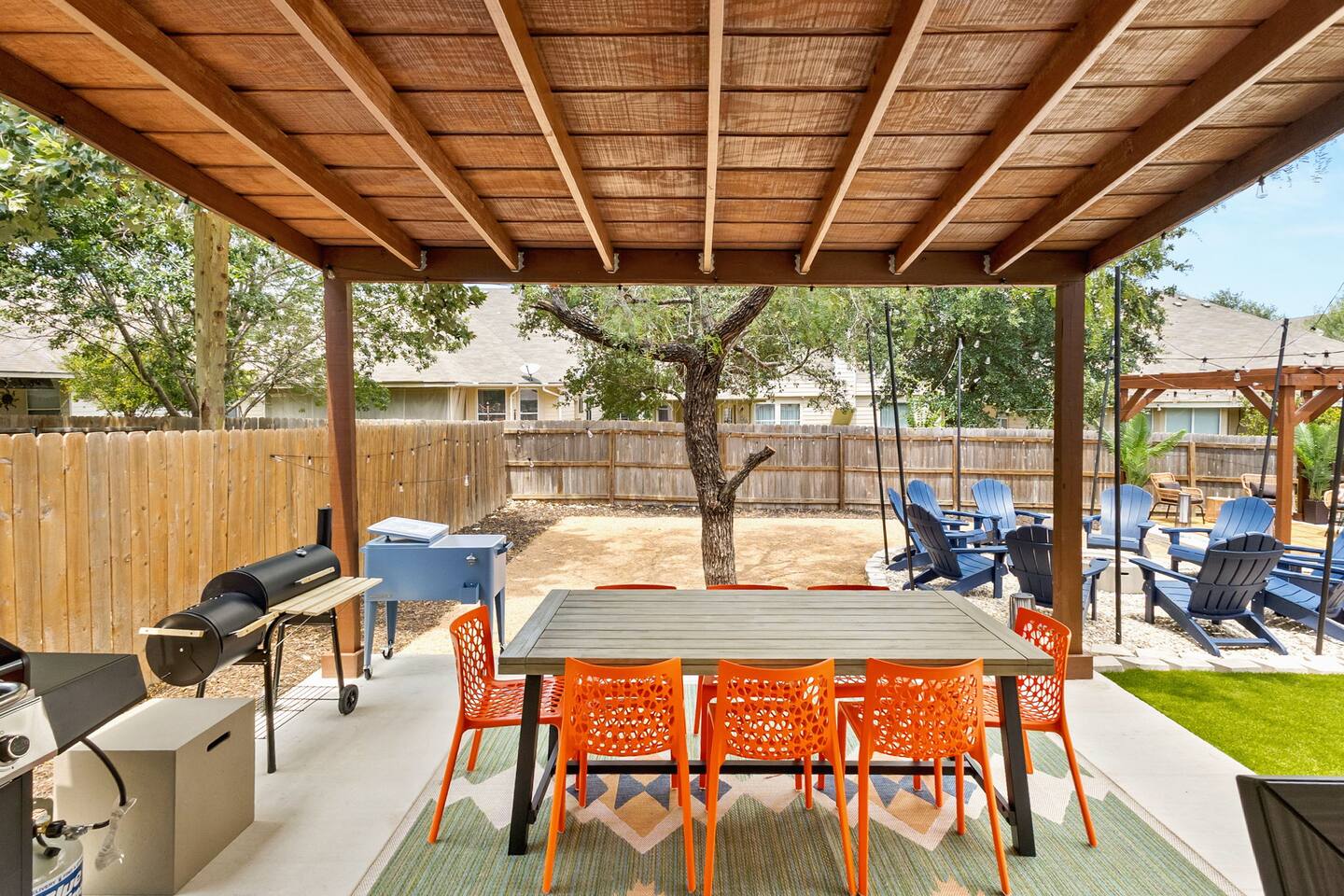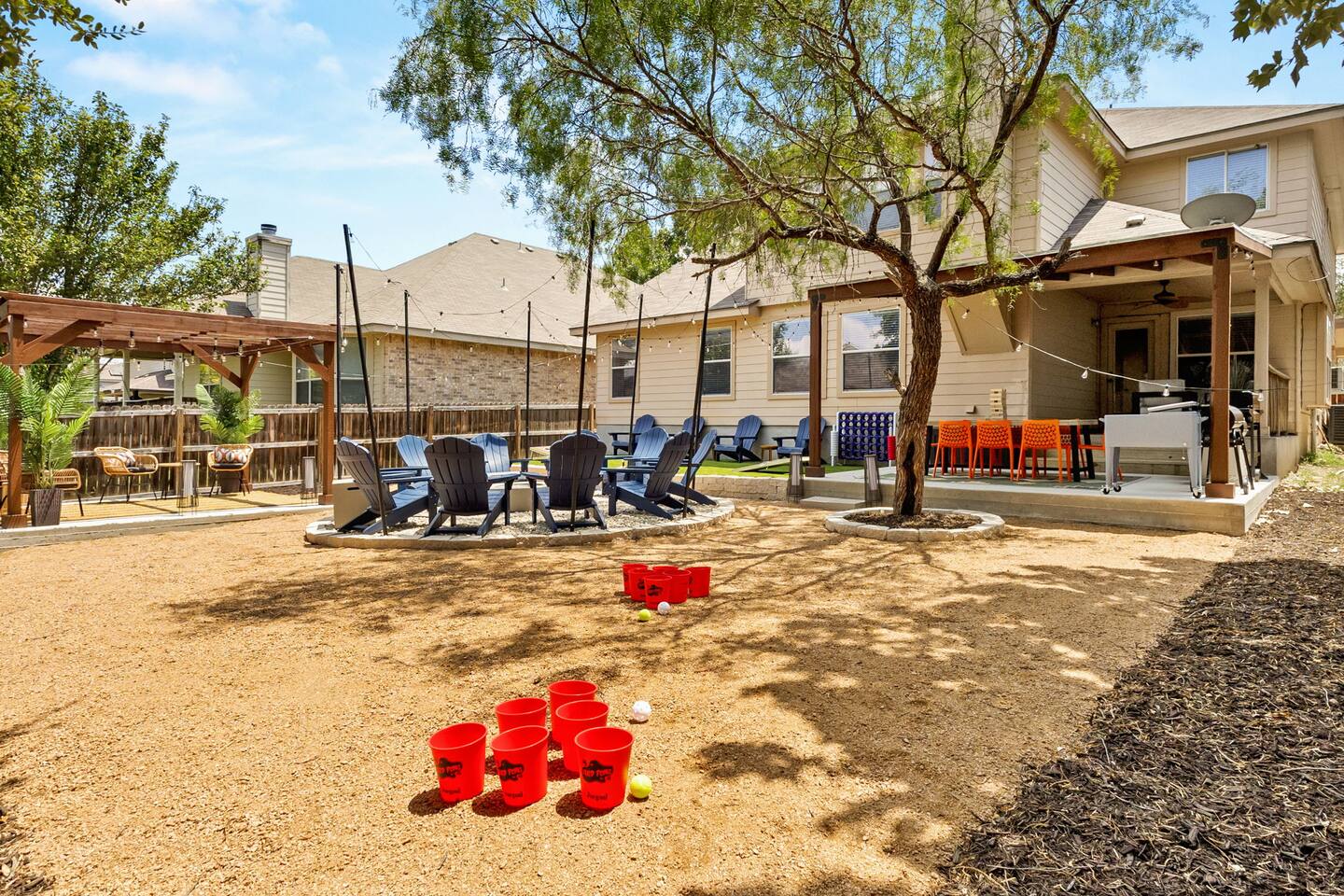 🌞 Welcome to Amber Sol Retreat Your sun-kissed escape in San Antonio, TX! Inspired by warm terracotta vibes, this vibrant 4-bedroom, 3.5-bath getaway is tailor-made for families, large groups, military visitors, and BMT graduation guests. With space for up to 17 guests, Amber Sol blends comfort, entertainment, and relaxation into one unforgettable stay. 🛋️ Lounge & Laugh Indoors Kick back in the cozy living room with a sleeper sofa and Smart TV, or head upstairs to the game loft a playful paradise featuring: • ⚡ Air hockey table • 🎮 Retro game stick with 20,000+ games • 🧸 Toy nook for the littles • 🛏️ Convertible couch bed for extra sleep space Then level up in the garage game room, packed with: • 🎱 Pool table • 🥌 Shuffleboard • 🕹️ Arcade cabinet • ♠️ Poker table • 🎯 Dartboard • 📺 65” Smart TV • ❄️ Full-size fridge & mini split A/C to keep things cool 🛌 Sleep Like Royalty – Room for 17 Every bedroom has a Smart TV and plenty of cozy space: • 🛏️ 3 King bedrooms (2 include full-size futons for bonus sleep spots) • 🛏️ 1 Bunk room with 2 full-over-full bunk beds & retro gaming fun • 🛋️ Loft with a quirky sofa-to-bed setup • 💤 Living room sleeper sofa for those movie-night crashes 🍳 Cook, Dine, and Sip in Style You’ll feel right at home in the fully stocked kitchen: • 🍽️ Pots, pans, dishes, utensils! All ready for your crew • ☕ Keurig combo coffee maker (with coffee included!) • 🍴 Indoor dining spaces for everyone to gather, featuring two dining areas, one with seating for 8 and another with seating for 6 • 🌤️ Outdoor dining table (seats 8) + extra turf seating (seats 4) 🌵 Backyard Bliss – Your Private Outdoor Oasis Step outside and let the good times roll: • 🌞 Two covered patios with comfy seating • 🔥 Firepit area with space for 10 to cozy up • 🏕️ Turf yard perfect for lawn games and lounging • 🍹 Pergola lounge for shady hangs • 🔥 Propane & charcoal grills ready for BBQ nights • 🧊 Outdoor ice chest + pool bar stocked with tumblers, coolers, tote bag & water shooters • 🎟️ Stadium chairs and extra coolers available for guests attending BMT graduation days so you can stay comfortable and prepared while cheering on your Airman! ❄️ Stay Cool, Stay Comfortable • 🌬️ Dual A/C zones for personalized temps • 🧺 In-unit washer & dryer (with detergent & dryer sheets!) • 🔐 Easy self-check-in via smart lock • 🚗 Free parking in driveway and street (accommodates 3 vehicles) 🏀 Neighborhood Fun – Just a Short Stroll Away (0.4 mi / 8 min walk!) • 🏊♀️ Community pool – Operating hours and time frame is 9 AM – 9 PM (March [spring break week] –December) • 🏀 Basketball court • 👧 Children’s playgrounds 📍 Explore San Antonio – Nearby Hot Spots 🎢 SeaWorld – 5 mi 🎠 Six Flags Fiesta Texas – 17 mi 🎖️ Lackland AFB – 10 mi 🎖️ Randolph AFB – 38 mi 🌆 Downtown / Riverwalk – 19 mi 🏙️ Fort Sam Houston – 23 mi 🍴 The Pearl – 16 mi 🛍️ Shopping & Dining (5–25 min drive): • Alamo Ranch – 6.1 mi • Dove Creek – 1.5 mi • La Cantera – 16 mi Whether you’re celebrating a special moment, reuniting with family, or cheering on your Airman at BMT graduation, Amber Sol Retreat has everything you need—and then some. ✨ Book your unforgettable San Antonio stay today! PLEASE NOTE: We take guest security and safety seriously, no fraudulent bookings allowed. Guests must complete an easy, online hotel-style check-in with a Rental Agreement.