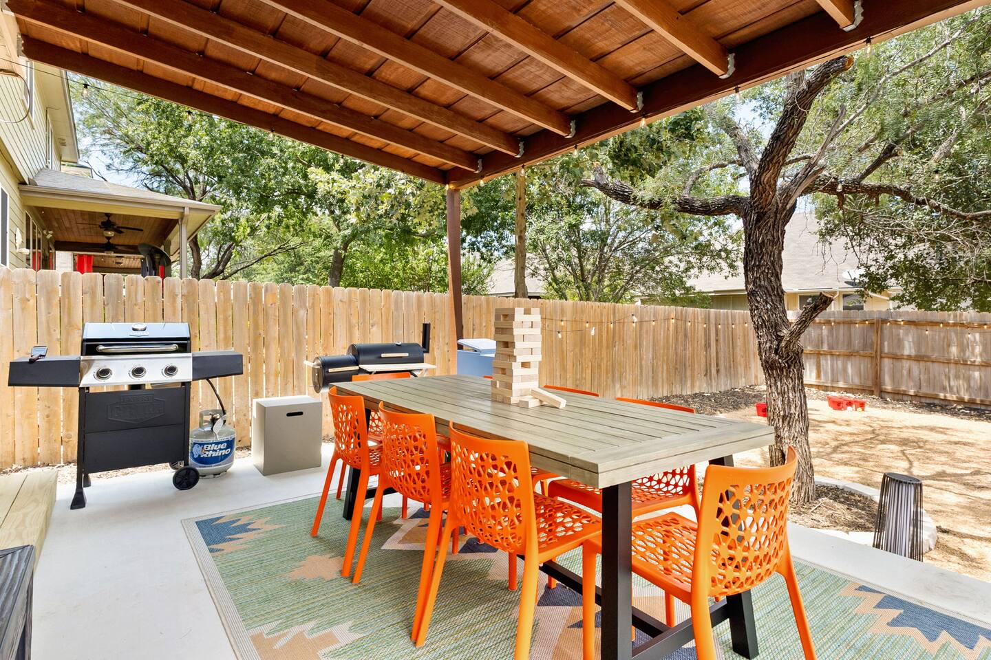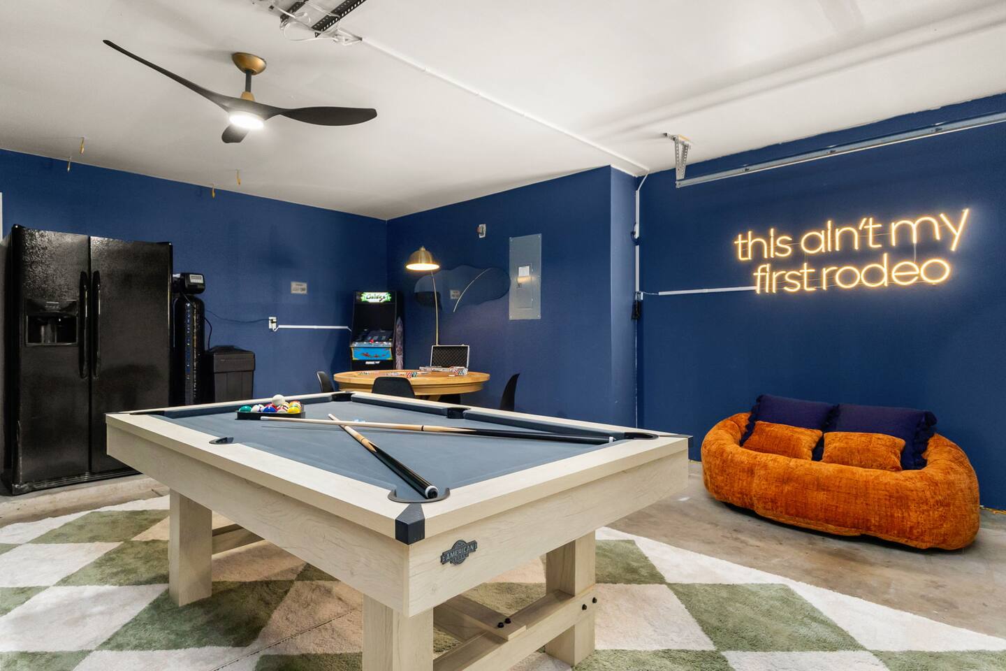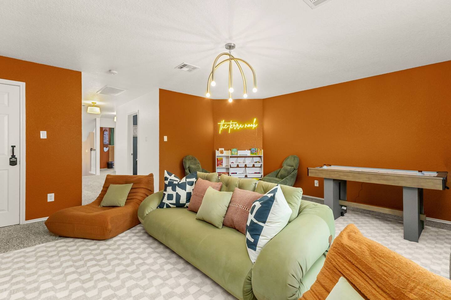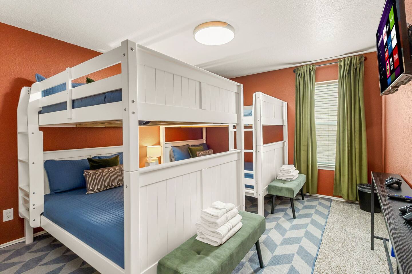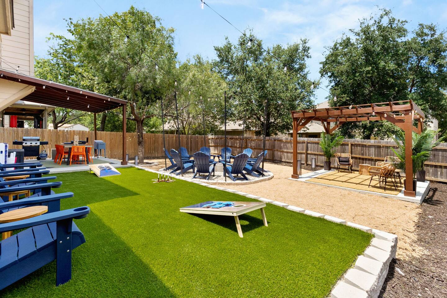 🌞 Welcome to Amber Sol Retreat Your sun-kissed escape in San Antonio, TX! Inspired by warm terracotta vibes, this vibrant 4-bedroom, 3.5-bath getaway is tailor-made for families, large groups, military visitors, and BMT graduation guests. With space for up to 17 guests, Amber Sol blends comfort, entertainment, and relaxation into one unforgettable stay. 🛋️ Lounge & Laugh Indoors Kick back in the cozy living room with a sleeper sofa and Smart TV, or head upstairs to the game loft a playful paradise featuring: • ⚡ Air hockey table • 🎮 Retro game stick with 20,000+ games • 🧸 Toy nook for the littles • 🛏️ Convertible couch bed for extra sleep space Then level up in the garage game room, packed with: • 🎱 Pool table • 🥌 Shuffleboard • 🕹️ Arcade cabinet • ♠️ Poker table • 🎯 Dartboard • 📺 65” Smart TV • ❄️ Full-size fridge & mini split A/C to keep things cool 🛌 Sleep Like Royalty – Room for 17 Every bedroom has a Smart TV and plenty of cozy space: • 🛏️ 3 King bedrooms (2 include full-size futons for bonus sleep spots) • 🛏️ 1 Bunk room with 2 full-over-full bunk beds & retro gaming fun • 🛋️ Loft with a quirky sofa-to-bed setup • 💤 Living room sleeper sofa for those movie-night crashes 🍳 Cook, Dine, and Sip in Style You’ll feel right at home in the fully stocked kitchen: • 🍽️ Pots, pans, dishes, utensils! All ready for your crew • ☕ Keurig combo coffee maker (with coffee included!) • 🍴 Indoor dining spaces for everyone to gather, featuring two dining areas, one with seating for 8 and another with seating for 6 • 🌤️ Outdoor dining table (seats 8) + extra turf seating (seats 4) 🌵 Backyard Bliss – Your Private Outdoor Oasis Step outside and let the good times roll: • 🌞 Two covered patios with comfy seating • 🔥 Firepit area with space for 10 to cozy up • 🏕️ Turf yard perfect for lawn games and lounging • 🍹 Pergola lounge for shady hangs • 🔥 Propane & charcoal grills ready for BBQ nights • 🧊 Outdoor ice chest + pool bar stocked with tumblers, coolers, tote bag & water shooters • 🎟️ Stadium chairs and extra coolers available for guests attending BMT graduation days so you can stay comfortable and prepared while cheering on your Airman! ❄️ Stay Cool, Stay Comfortable • 🌬️ Dual A/C zones for personalized temps • 🧺 In-unit washer & dryer (with detergent & dryer sheets!) • 🔐 Easy self-check-in via smart lock • 🚗 Free parking in driveway and street (accommodates 3 vehicles) 🏀 Neighborhood Fun – Just a Short Stroll Away (0.4 mi / 8 min walk!) • 🏊♀️ Community pool – Operating hours and time frame is 9 AM – 9 PM (March [spring break week] –December) • 🏀 Basketball court • 👧 Children’s playgrounds 📍 Explore San Antonio – Nearby Hot Spots 🎢 SeaWorld – 5 mi 🎠 Six Flags Fiesta Texas – 17 mi 🎖️ Lackland AFB – 10 mi 🎖️ Randolph AFB – 38 mi 🌆 Downtown / Riverwalk – 19 mi 🏙️ Fort Sam Houston – 23 mi 🍴 The Pearl – 16 mi 🛍️ Shopping & Dining (5–25 min drive): • Alamo Ranch – 6.1 mi • Dove Creek – 1.5 mi • La Cantera – 16 mi Whether you’re celebrating a special moment, reuniting with family, or cheering on your Airman at BMT graduation, Amber Sol Retreat has everything you need—and then some. ✨ Book your unforgettable San Antonio stay today! PLEASE NOTE: We take guest security and safety seriously, no fraudulent bookings allowed. Guests must complete an easy, online hotel-style check-in with a Rental Agreement.
