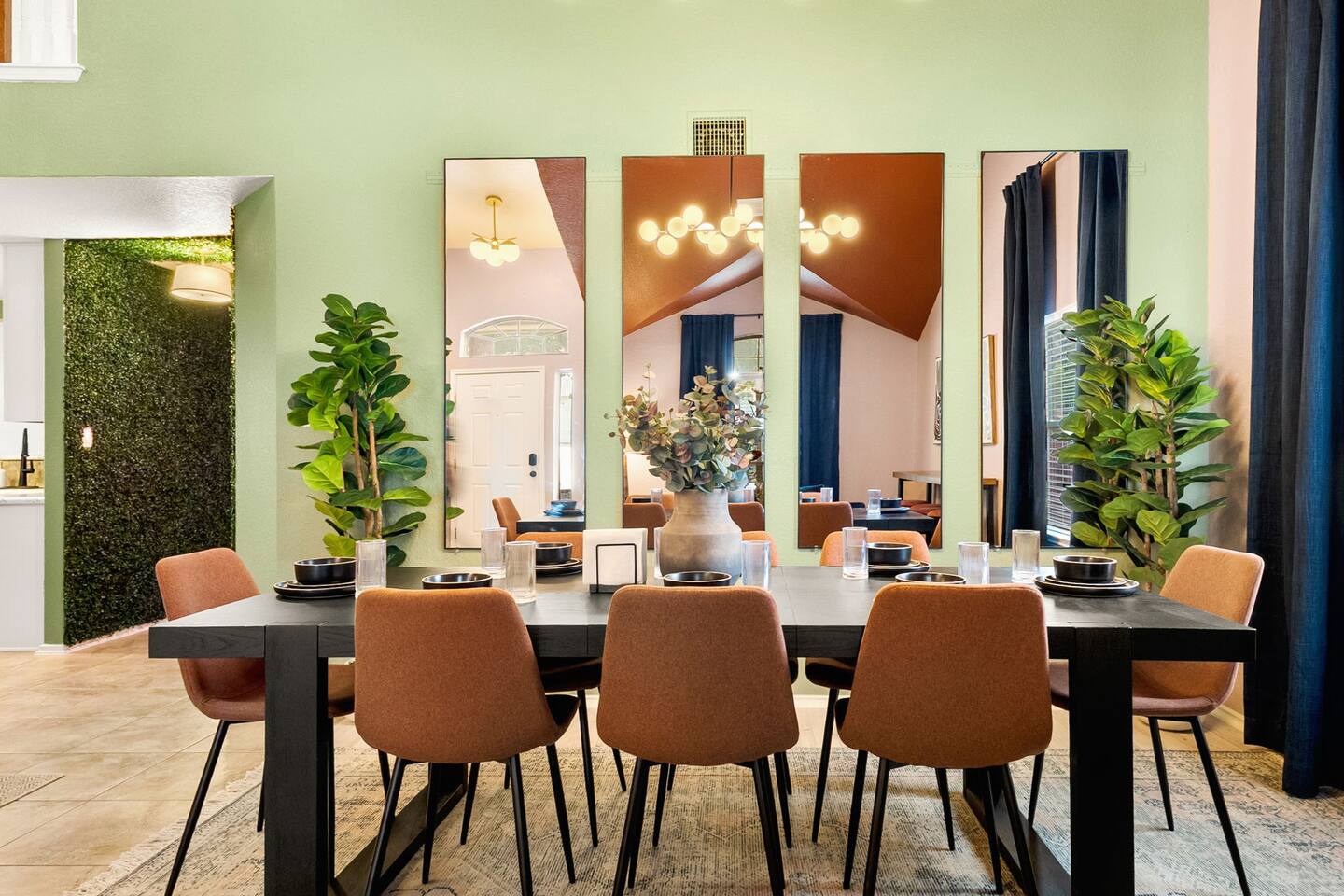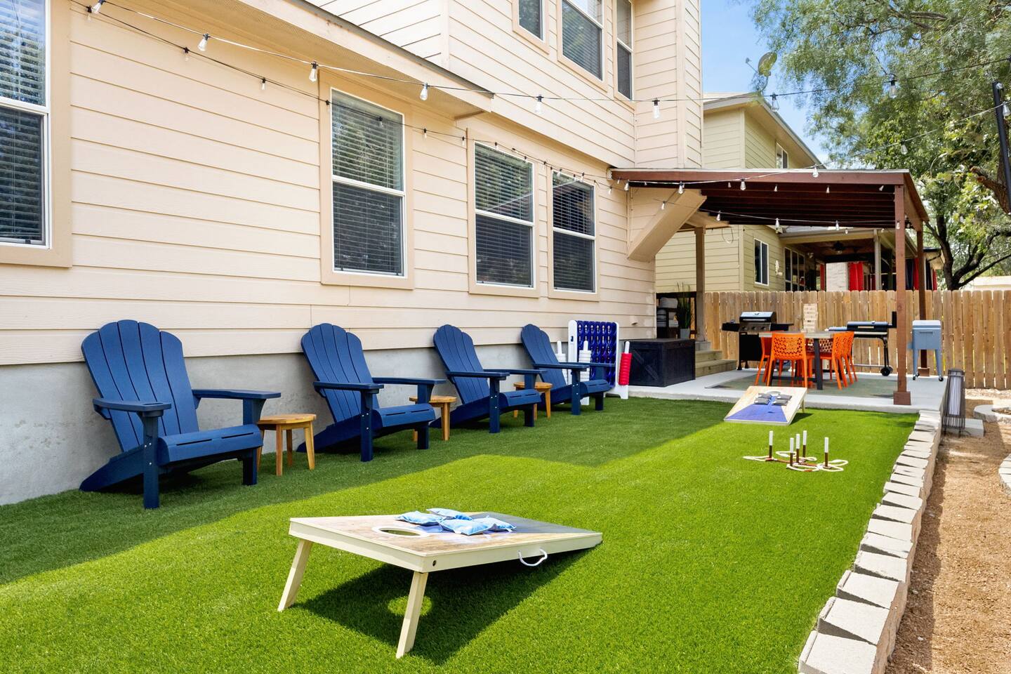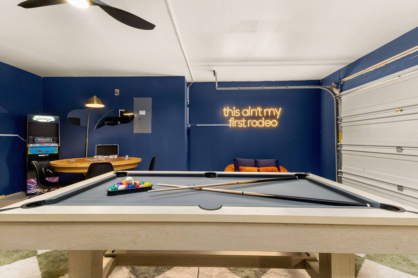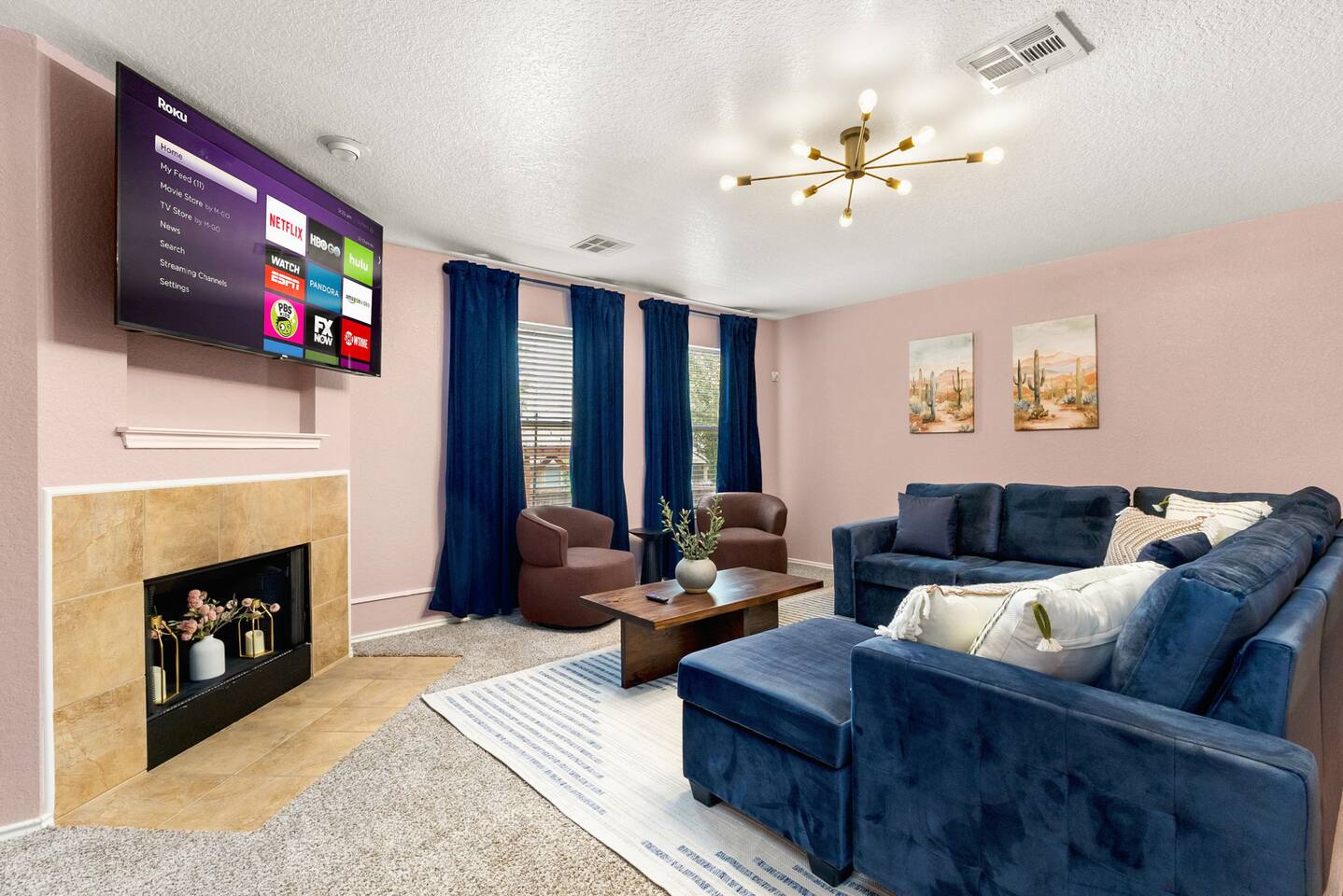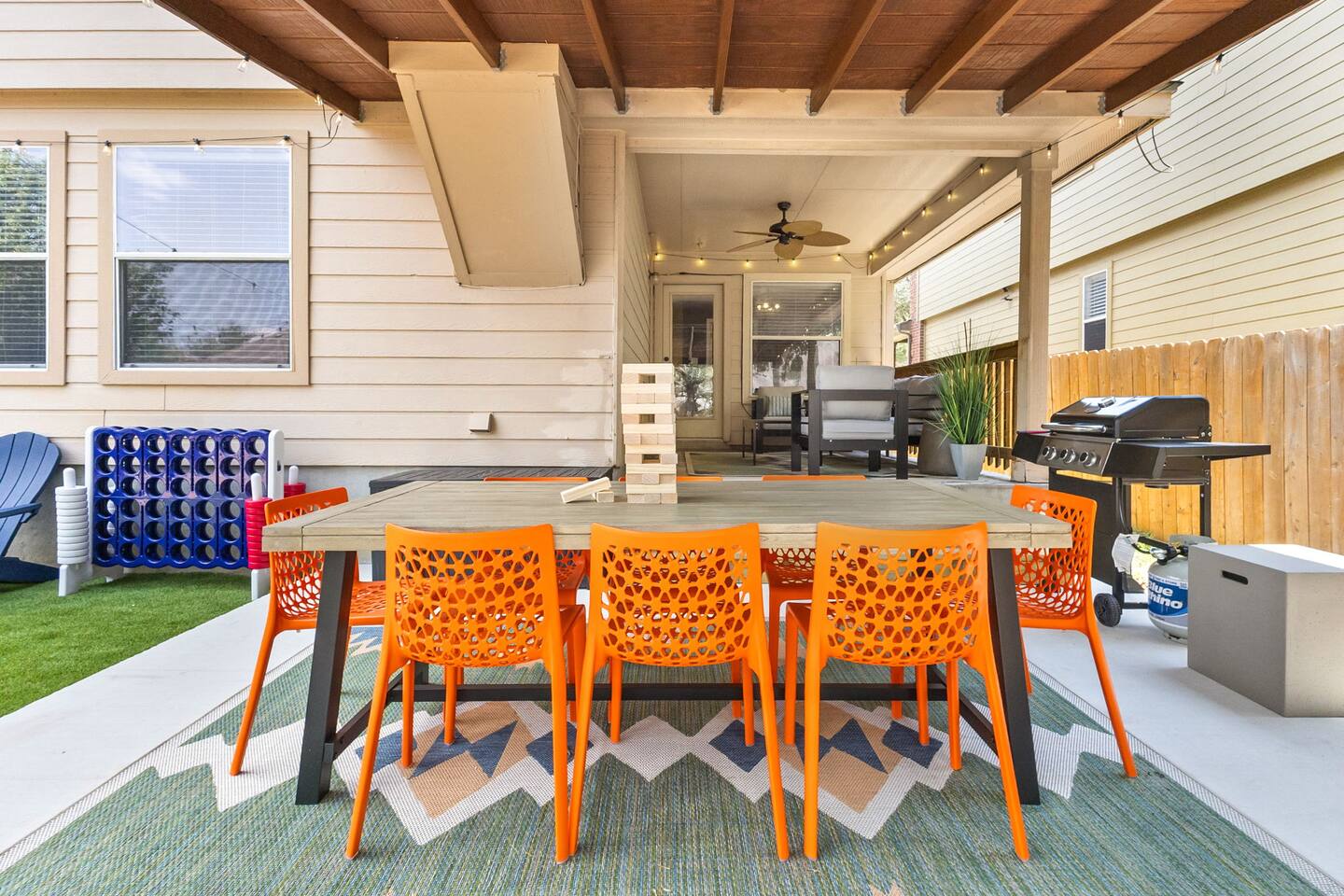 🌞 Welcome to Amber Sol Retreat Your sun-kissed escape in San Antonio, TX! Inspired by warm terracotta vibes, this vibrant 4-bedroom, 3.5-bath getaway is tailor-made for families, large groups, military visitors, and BMT graduation guests. With space for up to 17 guests, Amber Sol blends comfort, entertainment, and relaxation into one unforgettable stay. 🛋️ Lounge & Laugh Indoors Kick back in the cozy living room with a sleeper sofa and Smart TV, or head upstairs to the game loft a playful paradise featuring: • ⚡ Air hockey table • 🎮 Retro game stick with 20,000+ games • 🧸 Toy nook for the littles • 🛏️ Convertible couch bed for extra sleep space Then level up in the garage game room, packed with: • 🎱 Pool table • 🥌 Shuffleboard • 🕹️ Arcade cabinet • ♠️ Poker table • 🎯 Dartboard • 📺 65” Smart TV • ❄️ Full-size fridge & mini split A/C to keep things cool 🛌 Sleep Like Royalty – Room for 17 Every bedroom has a Smart TV and plenty of cozy space: • 🛏️ 3 King bedrooms (2 include full-size futons for bonus sleep spots) • 🛏️ 1 Bunk room with 2 full-over-full bunk beds & retro gaming fun • 🛋️ Loft with a quirky sofa-to-bed setup • 💤 Living room sleeper sofa for those movie-night crashes 🍳 Cook, Dine, and Sip in Style You’ll feel right at home in the fully stocked kitchen: • 🍽️ Pots, pans, dishes, utensils! All ready for your crew • ☕ Keurig combo coffee maker (with coffee included!) • 🍴 Indoor dining spaces for everyone to gather, featuring two dining areas, one with seating for 8 and another with seating for 6 • 🌤️ Outdoor dining table (seats 8) + extra turf seating (seats 4) 🌵 Backyard Bliss – Your Private Outdoor Oasis Step outside and let the good times roll: • 🌞 Two covered patios with comfy seating • 🔥 Firepit area with space for 10 to cozy up • 🏕️ Turf yard perfect for lawn games and lounging • 🍹 Pergola lounge for shady hangs • 🔥 Propane & charcoal grills ready for BBQ nights • 🧊 Outdoor ice chest + pool bar stocked with tumblers, coolers, tote bag & water shooters • 🎟️ Stadium chairs and extra coolers available for guests attending BMT graduation days so you can stay comfortable and prepared while cheering on your Airman! ❄️ Stay Cool, Stay Comfortable • 🌬️ Dual A/C zones for personalized temps • 🧺 In-unit washer & dryer (with detergent & dryer sheets!) • 🔐 Easy self-check-in via smart lock • 🚗 Free parking in driveway and street (accommodates 3 vehicles) 🏀 Neighborhood Fun – Just a Short Stroll Away (0.4 mi / 8 min walk!) • 🏊♀️ Community pool – Operating hours and time frame is 9 AM – 9 PM (March [spring break week] –December) • 🏀 Basketball court • 👧 Children’s playgrounds 📍 Explore San Antonio – Nearby Hot Spots 🎢 SeaWorld – 5 mi 🎠 Six Flags Fiesta Texas – 17 mi 🎖️ Lackland AFB – 10 mi 🎖️ Randolph AFB – 38 mi 🌆 Downtown / Riverwalk – 19 mi 🏙️ Fort Sam Houston – 23 mi 🍴 The Pearl – 16 mi 🛍️ Shopping & Dining (5–25 min drive): • Alamo Ranch – 6.1 mi • Dove Creek – 1.5 mi • La Cantera – 16 mi Whether you’re celebrating a special moment, reuniting with family, or cheering on your Airman at BMT graduation, Amber Sol Retreat has everything you need—and then some. ✨ Book your unforgettable San Antonio stay today! PLEASE NOTE: We take guest security and safety seriously, no fraudulent bookings allowed. Guests must complete an easy, online hotel-style check-in with a Rental Agreement.