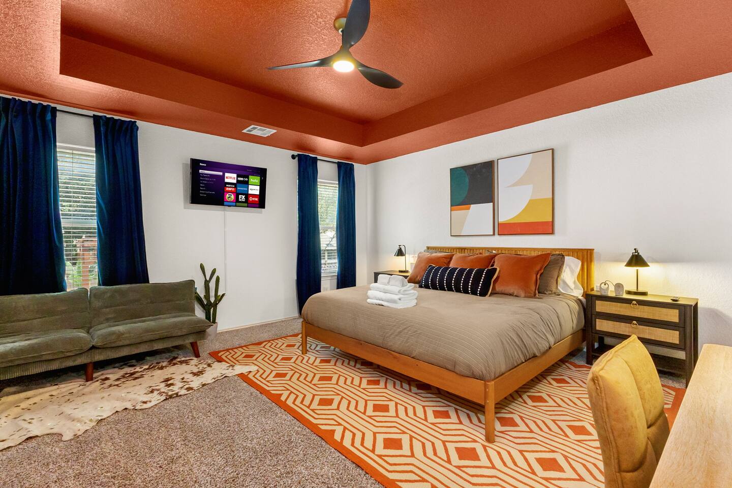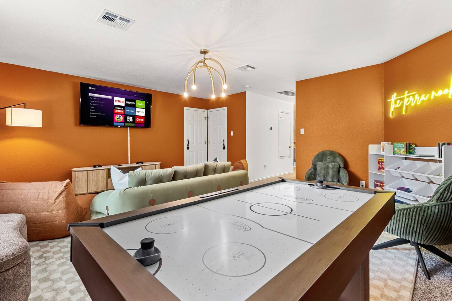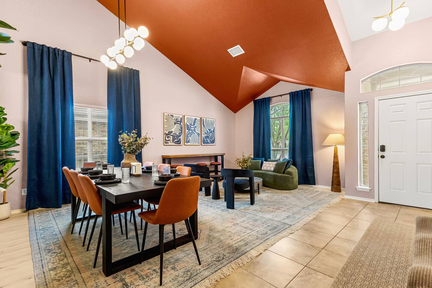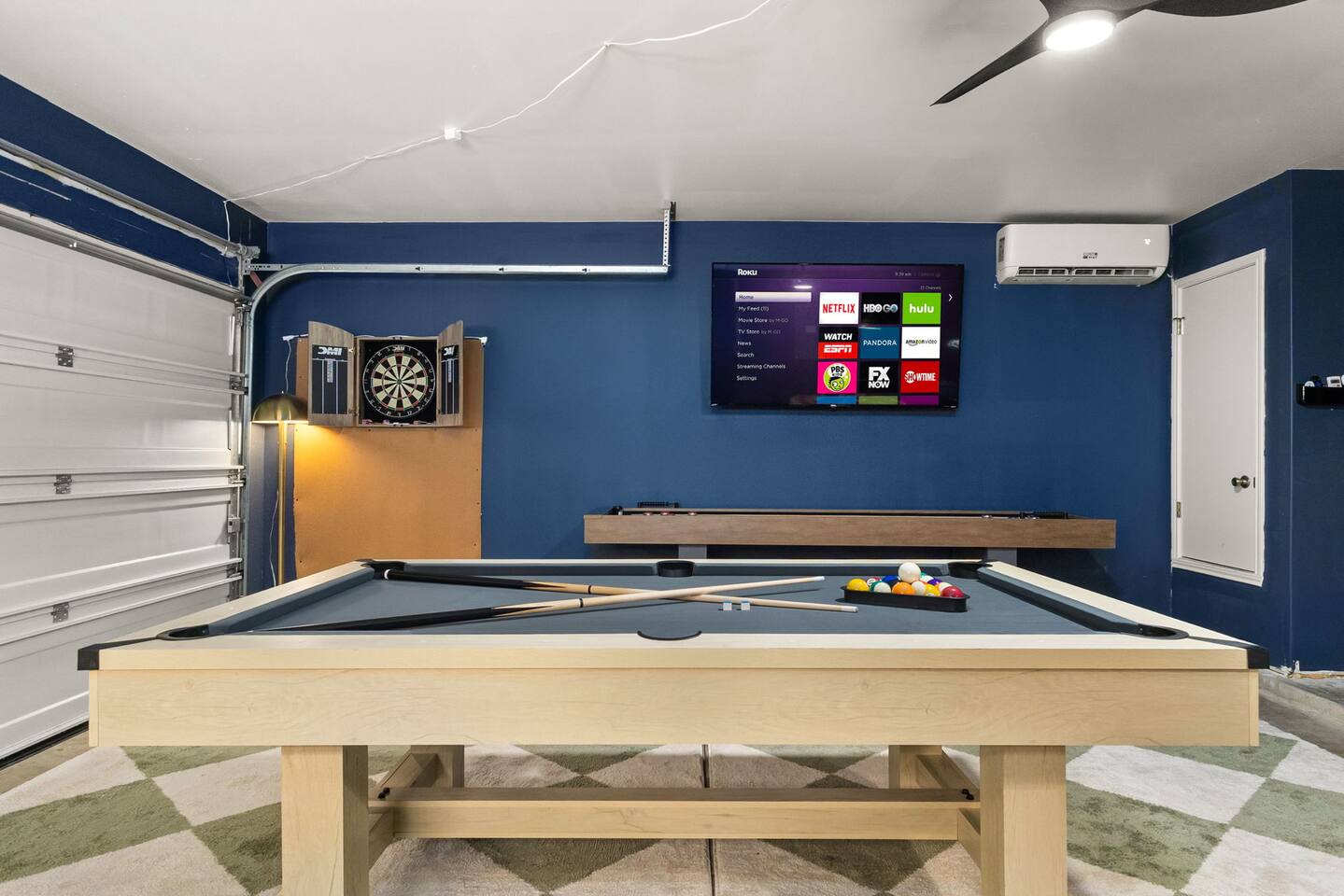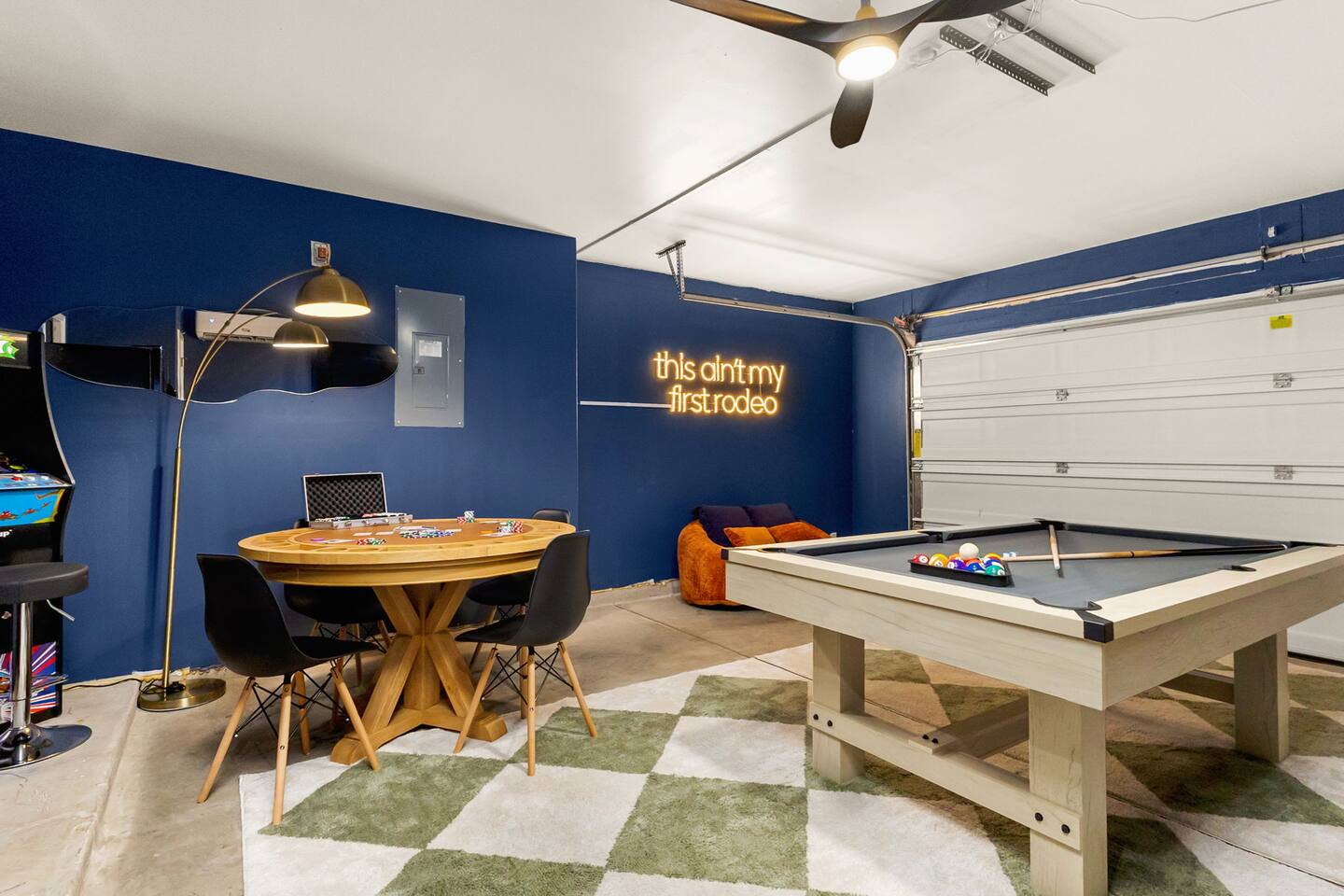🌞 Welcome to Amber Sol Retreat Your sun-kissed escape in San Antonio, TX! Inspired by warm terracotta vibes, this vibrant 4-bedroom, 3.5-bath getaway is tailor-made for families, large groups, military visitors, and BMT graduation guests. With space for up to 17 guests, Amber Sol blends comfort, entertainment, and relaxation into one unforgettable stay. 🛋️ Lounge & Laugh Indoors Kick back in the cozy living room with a sleeper sofa and Smart TV, or head upstairs to the game loft a playful paradise featuring: • ⚡ Air hockey table • 🎮 Retro game stick with 20,000+ games • 🧸 Toy nook for the littles • 🛏️ Convertible couch bed for extra sleep space Then level up in the garage game room, packed with: • 🎱 Pool table • 🥌 Shuffleboard • 🕹️ Arcade cabinet • ♠️ Poker table • 🎯 Dartboard • 📺 65” Smart TV • ❄️ Full-size fridge & mini split A/C to keep things cool 🛌 Sleep Like Royalty – Room for 17 Every bedroom has a Smart TV and plenty of cozy space: • 🛏️ 3 King bedrooms (2 include full-size futons for bonus sleep spots) • 🛏️ 1 Bunk room with 2 full-over-full bunk beds & retro gaming fun • 🛋️ Loft with a quirky sofa-to-bed setup • 💤 Living room sleeper sofa for those movie-night crashes 🍳 Cook, Dine, and Sip in Style You’ll feel right at home in the fully stocked kitchen: • 🍽️ Pots, pans, dishes, utensils! All ready for your crew • ☕ Keurig combo coffee maker (with coffee included!) • 🍴 Indoor dining spaces for everyone to gather, featuring two dining areas, one with seating for 8 and another with seating for 6 • 🌤️ Outdoor dining table (seats 8) + extra turf seating (seats 4) 🌵 Backyard Bliss – Your Private Outdoor Oasis Step outside and let the good times roll: • 🌞 Two covered patios with comfy seating • 🔥 Firepit area with space for 10 to cozy up • 🏕️ Turf yard perfect for lawn games and lounging • 🍹 Pergola lounge for shady hangs • 🔥 Propane & charcoal grills ready for BBQ nights • 🧊 Outdoor ice chest + pool bar stocked with tumblers, coolers, tote bag & water shooters • 🎟️ Stadium chairs and extra coolers available for guests attending BMT graduation days so you can stay comfortable and prepared while cheering on your Airman! ❄️ Stay Cool, Stay Comfortable • 🌬️ Dual A/C zones for personalized temps • 🧺 In-unit washer & dryer (with detergent & dryer sheets!) • 🔐 Easy self-check-in via smart lock • 🚗 Free parking in driveway and street (accommodates 3 vehicles) 🏀 Neighborhood Fun – Just a Short Stroll Away (0.4 mi / 8 min walk!) • 🏊♀️ Community pool – Operating hours and time frame is 9 AM – 9 PM (March [spring break week] –December) • 🏀 Basketball court • 👧 Children’s playgrounds 📍 Explore San Antonio – Nearby Hot Spots 🎢 SeaWorld – 5 mi 🎠 Six Flags Fiesta Texas – 17 mi 🎖️ Lackland AFB – 10 mi 🎖️ Randolph AFB – 38 mi 🌆 Downtown / Riverwalk – 19 mi 🏙️ Fort Sam Houston – 23 mi 🍴 The Pearl – 16 mi 🛍️ Shopping & Dining (5–25 min drive): • Alamo Ranch – 6.1 mi • Dove Creek – 1.5 mi • La Cantera – 16 mi Whether you’re celebrating a special moment, reuniting with family, or cheering on your Airman at BMT graduation, Amber Sol Retreat has everything you need—and then some. ✨ Book your unforgettable San Antonio stay today! PLEASE NOTE: We take guest security and safety seriously, no fraudulent bookings allowed. Guests must complete an easy, online hotel-style check-in with a Rental Agreement.