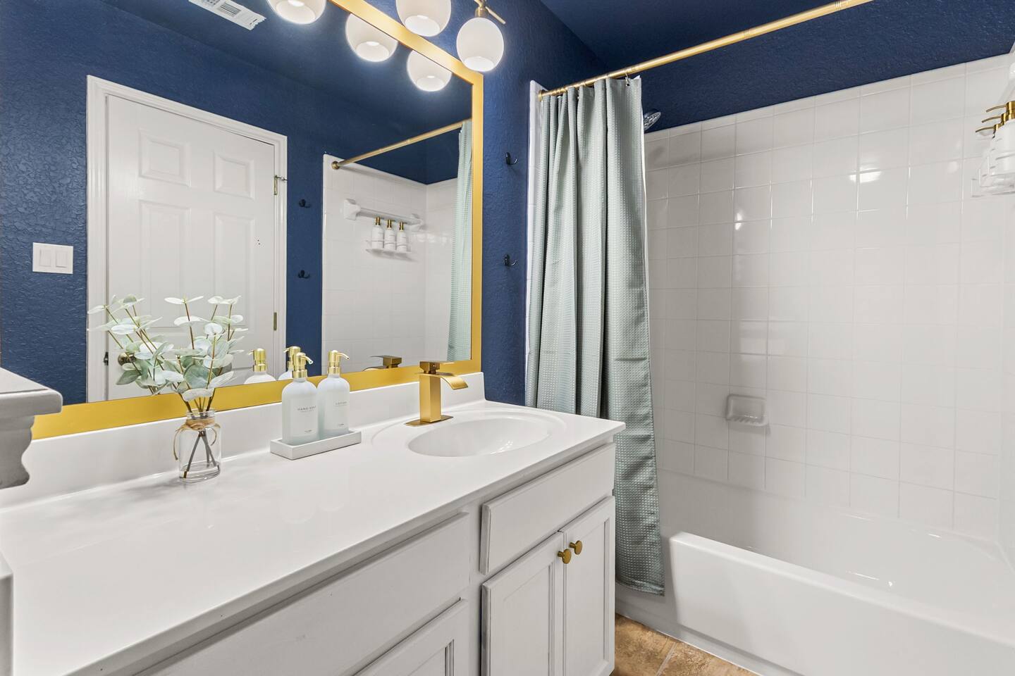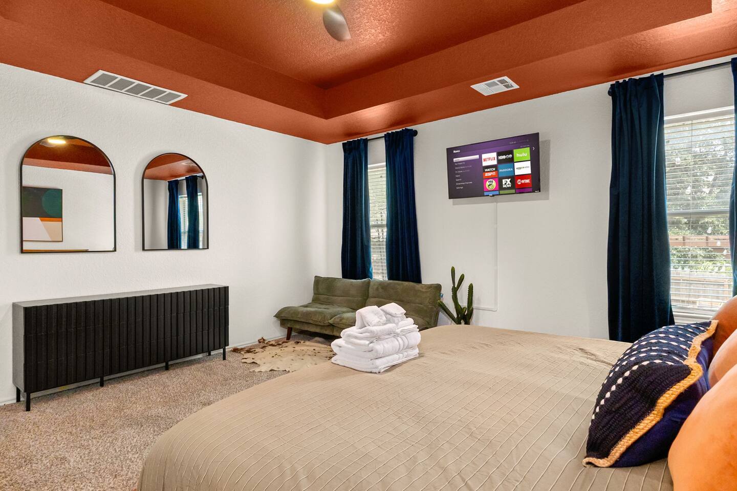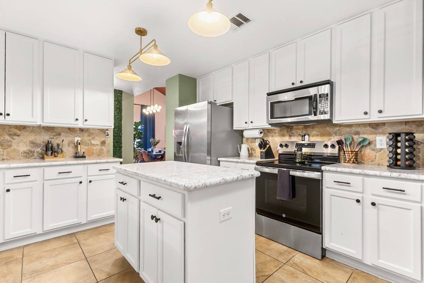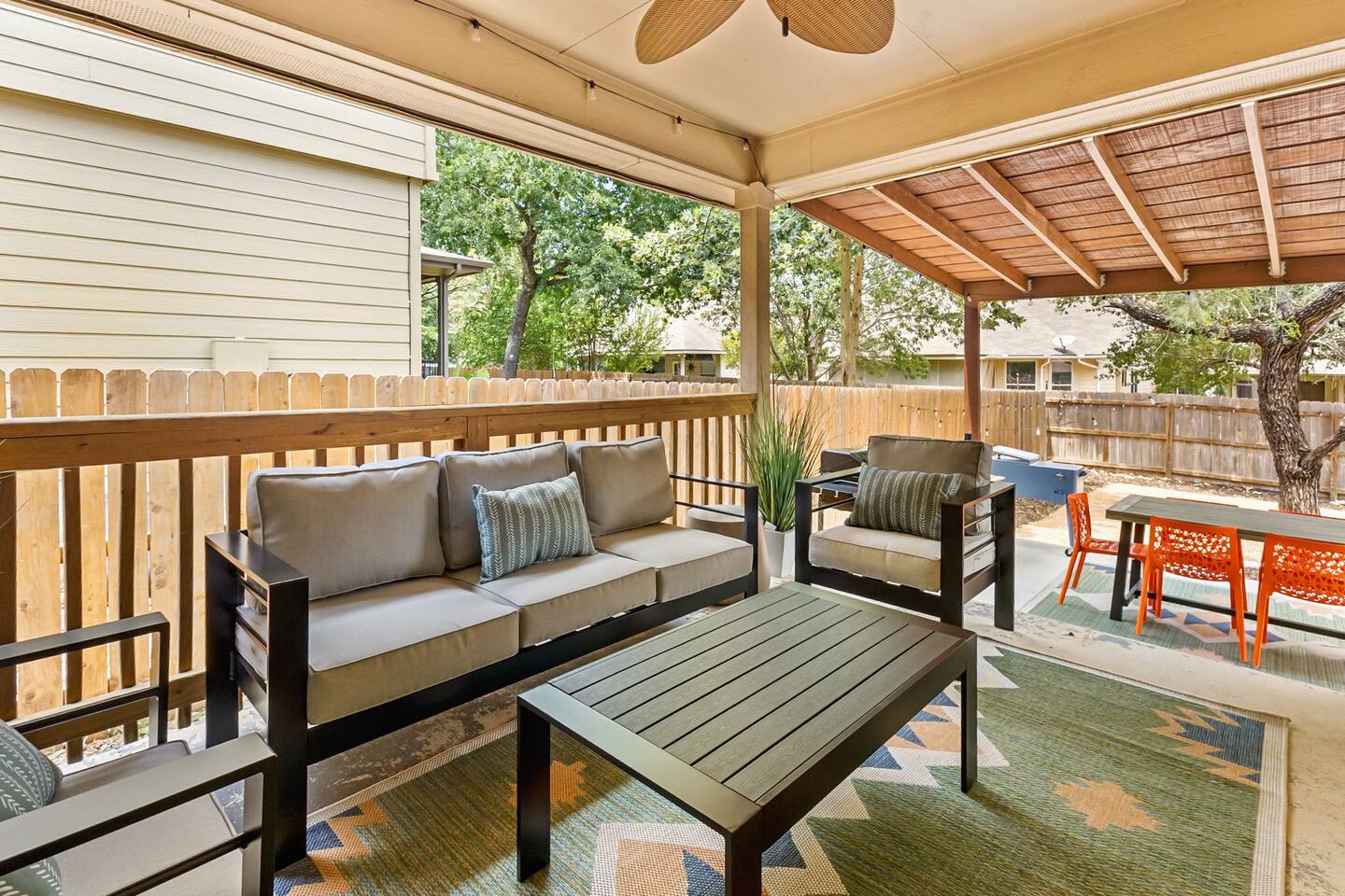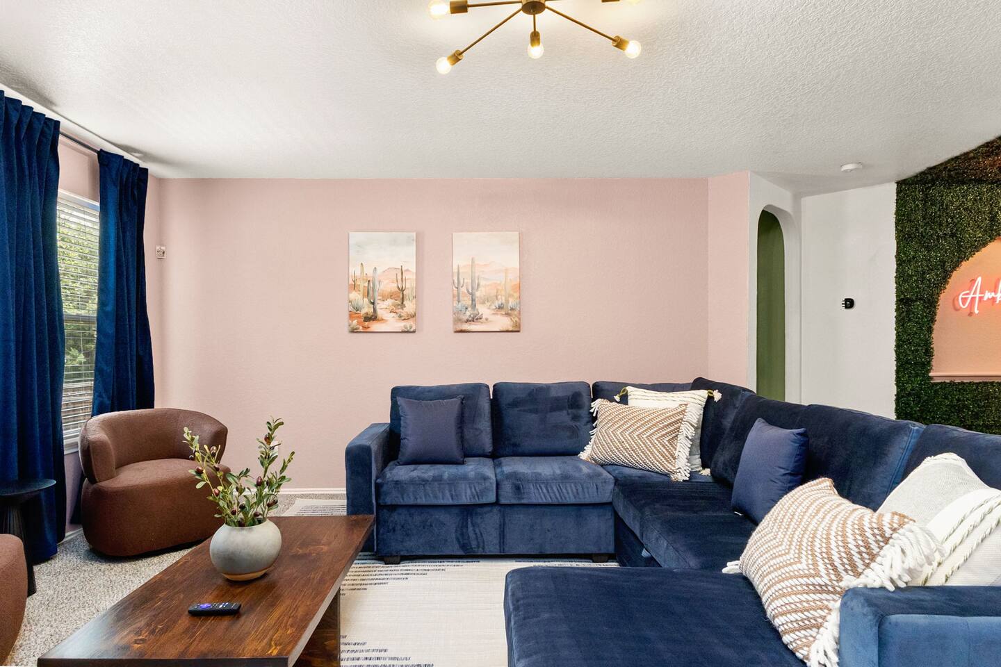 🌞 Welcome to Amber Sol Retreat Your sun-kissed escape in San Antonio, TX! Inspired by warm terracotta vibes, this vibrant 4-bedroom, 3.5-bath getaway is tailor-made for families, large groups, military visitors, and BMT graduation guests. With space for up to 17 guests, Amber Sol blends comfort, entertainment, and relaxation into one unforgettable stay. 🛋️ Lounge & Laugh Indoors Kick back in the cozy living room with a sleeper sofa and Smart TV, or head upstairs to the game loft a playful paradise featuring: • ⚡ Air hockey table • 🎮 Retro game stick with 20,000+ games • 🧸 Toy nook for the littles • 🛏️ Convertible couch bed for extra sleep space Then level up in the garage game room, packed with: • 🎱 Pool table • 🥌 Shuffleboard • 🕹️ Arcade cabinet • ♠️ Poker table • 🎯 Dartboard • 📺 65” Smart TV • ❄️ Full-size fridge & mini split A/C to keep things cool 🛌 Sleep Like Royalty – Room for 17 Every bedroom has a Smart TV and plenty of cozy space: • 🛏️ 3 King bedrooms (2 include full-size futons for bonus sleep spots) • 🛏️ 1 Bunk room with 2 full-over-full bunk beds & retro gaming fun • 🛋️ Loft with a quirky sofa-to-bed setup • 💤 Living room sleeper sofa for those movie-night crashes 🍳 Cook, Dine, and Sip in Style You’ll feel right at home in the fully stocked kitchen: • 🍽️ Pots, pans, dishes, utensils! All ready for your crew • ☕ Keurig combo coffee maker (with coffee included!) • 🍴 Indoor dining spaces for everyone to gather, featuring two dining areas, one with seating for 8 and another with seating for 6 • 🌤️ Outdoor dining table (seats 8) + extra turf seating (seats 4) 🌵 Backyard Bliss – Your Private Outdoor Oasis Step outside and let the good times roll: • 🌞 Two covered patios with comfy seating • 🔥 Firepit area with space for 10 to cozy up • 🏕️ Turf yard perfect for lawn games and lounging • 🍹 Pergola lounge for shady hangs • 🔥 Propane & charcoal grills ready for BBQ nights • 🧊 Outdoor ice chest + pool bar stocked with tumblers, coolers, tote bag & water shooters • 🎟️ Stadium chairs and extra coolers available for guests attending BMT graduation days so you can stay comfortable and prepared while cheering on your Airman! ❄️ Stay Cool, Stay Comfortable • 🌬️ Dual A/C zones for personalized temps • 🧺 In-unit washer & dryer (with detergent & dryer sheets!) • 🔐 Easy self-check-in via smart lock • 🚗 Free parking in driveway and street (accommodates 3 vehicles) 🏀 Neighborhood Fun – Just a Short Stroll Away (0.4 mi / 8 min walk!) • 🏊♀️ Community pool – Operating hours and time frame is 9 AM – 9 PM (March [spring break week] –December) • 🏀 Basketball court • 👧 Children’s playgrounds 📍 Explore San Antonio – Nearby Hot Spots 🎢 SeaWorld – 5 mi 🎠 Six Flags Fiesta Texas – 17 mi 🎖️ Lackland AFB – 10 mi 🎖️ Randolph AFB – 38 mi 🌆 Downtown / Riverwalk – 19 mi 🏙️ Fort Sam Houston – 23 mi 🍴 The Pearl – 16 mi 🛍️ Shopping & Dining (5–25 min drive): • Alamo Ranch – 6.1 mi • Dove Creek – 1.5 mi • La Cantera – 16 mi Whether you’re celebrating a special moment, reuniting with family, or cheering on your Airman at BMT graduation, Amber Sol Retreat has everything you need—and then some. ✨ Book your unforgettable San Antonio stay today! PLEASE NOTE: We take guest security and safety seriously, no fraudulent bookings allowed. Guests must complete an easy, online hotel-style check-in with a Rental Agreement.